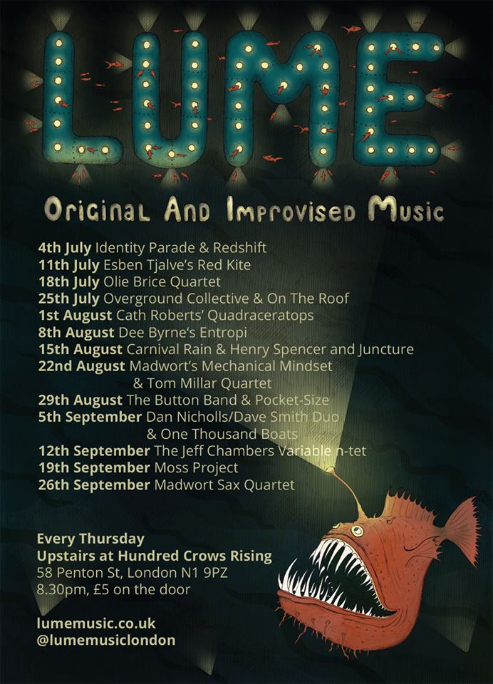 The upstairs room at Hundred Crows Rising in Angel will open it’s doors tonight to start a weekly programme of original and improvised music under the name of LUME. This new night run by myself and Cath Roberts kicks off at 8.30pm with two great bands from the SE Collective, Identity Parade and Redshift. Check out our flyer for bands appearing July-September.