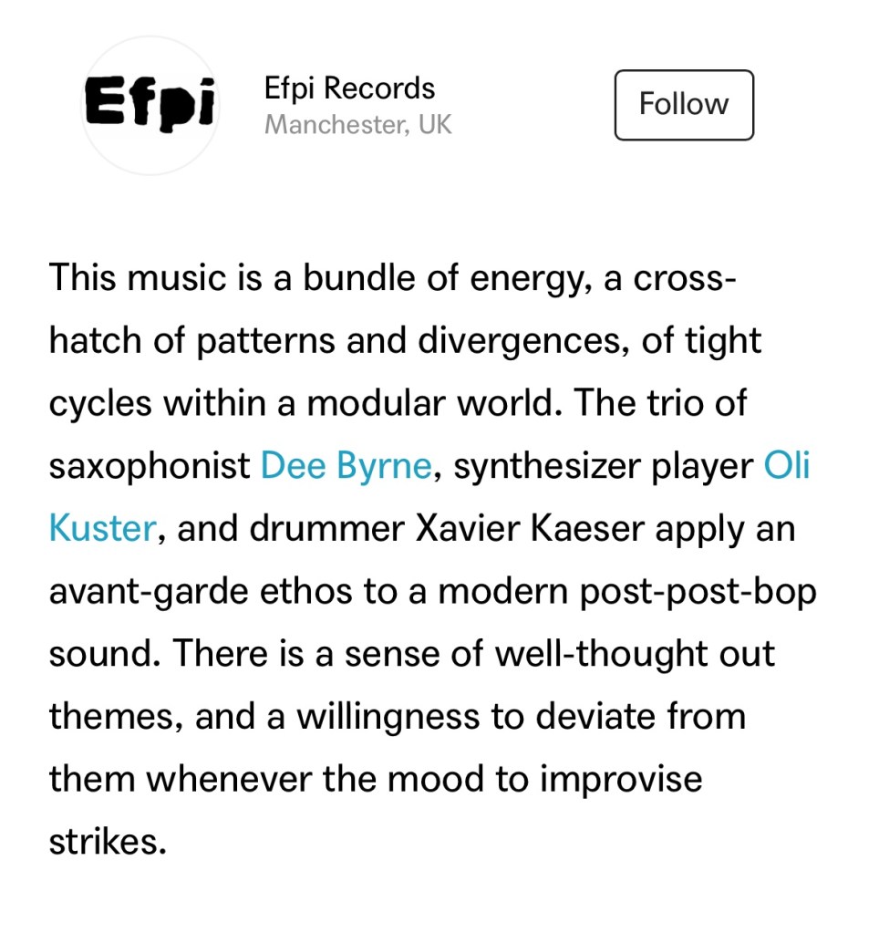 ‘The trio of saxophonist Dee Byrne, synthesizer player Oli Kuster, and drummer Xavier Kaeser apply an avant-garde ethos to a modern post-post-bop sound.’ Dave Sumner