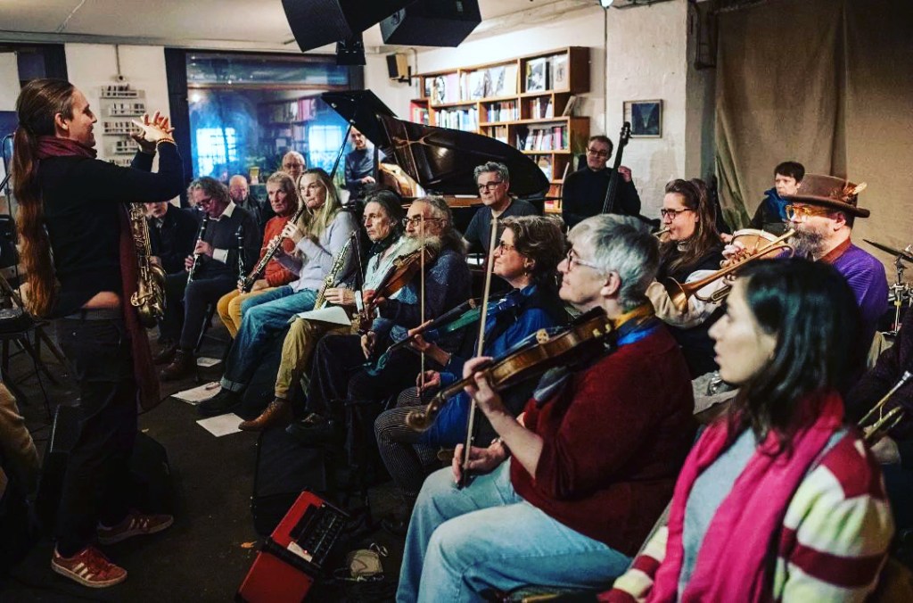 A relative newcomer, I’ve been attending since March 2019, and thoroughly enjoy playing in a improvising large ensemble with improvisers from diverse musical backgrounds. I’ve also learnt conduction through attending the monthly performances (first Sunday of the month) and now regularly conduct. It’s a fascinating experience that gets more enjoyable each time I do it.